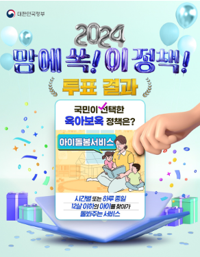 아이를 키우는 부모님이라면 누구나 공감할 중요한 과제, 자녀 돌봄. 부모가 일을 하거나 개인적인 사정으로 아이를 돌볼 수 없는 순간은 누구에게나 찾아옵니다. 이런 고민을 해결해주는 정부의 정책이 국민들로부터 큰 사랑을 받고 있습니다. 지난 11월 12일부터 21일까지 대한민국 정부 인스타그램에서 진행된 <맘에 쏙! 이 정책! – 육아보육편> 투표 결과, ‘아이돌봄서비스’가 가장 많은 선택을 받은 정책으로 선정되었습니다.